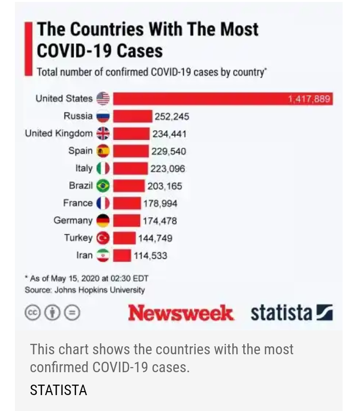 Worldwide there have been more than 4.4 million confirmed coronavirus cases. The United States has the highest number, followed by Russia second and the United Kingdom third.